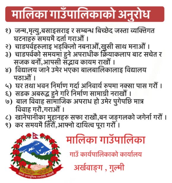 अर्घाखाँचीअर्घाखाँचीको शितगंगा नगरपालिका क्षेत्र भित्र स्थानीय फुललाई प्रवर्द्धन गर्न प्लाष्टिकका मालालाई निरुत्साहित गरी फुलका माला प्रयोगलाई प्रोत्साहित गर्न प्लाष्टिकका माला विकी वितरणको लागि रोक लगाउने भएको हो।