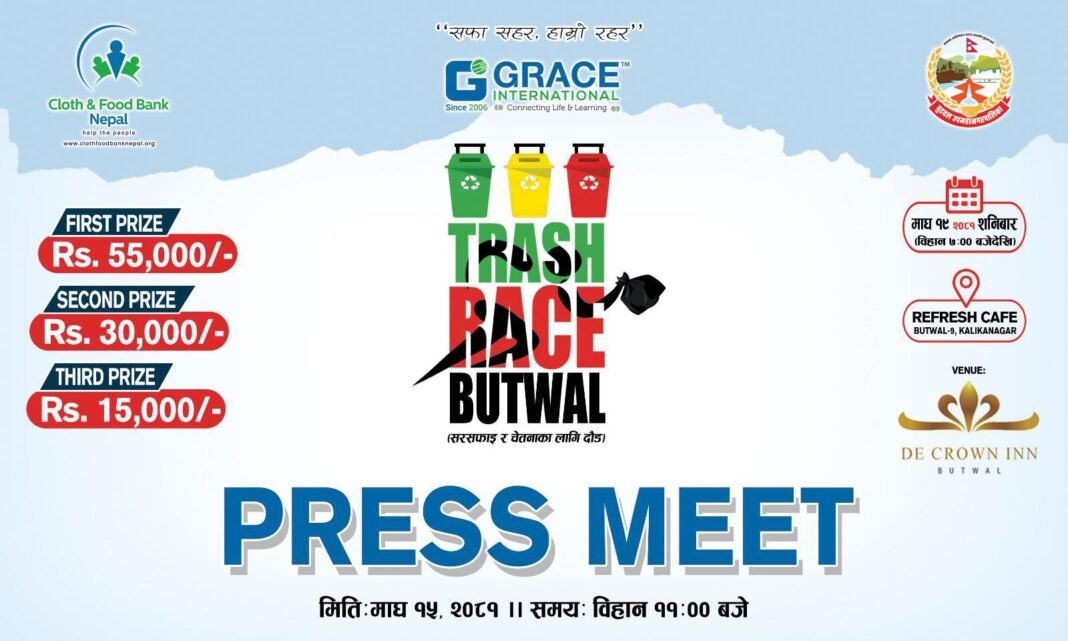 बुटवल बुटवलमा (ट्रयास रेस) फोहोर उठाउने प्रतियोगिता हुने भएको  ‘सफा सहर, हाम्रो रहरनारा सहित यही माघ १९ गते सफाईको जागरणका लागि बृहत फोहोर उठाउने दौड प्रतियोगिता हुने भएको हो