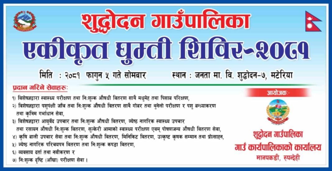 रुपन्देहीको शुद्धोदन गाउँपालिकाले एकिकृत घुम्ती शिविर संचालन गर्ने भएको छ । गाउँपालिकाको आयोजनामा फाल्गुण ५ गते(आज) शुद्धोदन गाउपालिकाका ७ मटेरियामा रहेको जनता मा वि मा उक्त शिविरको आयोजना गरिएको हो ।