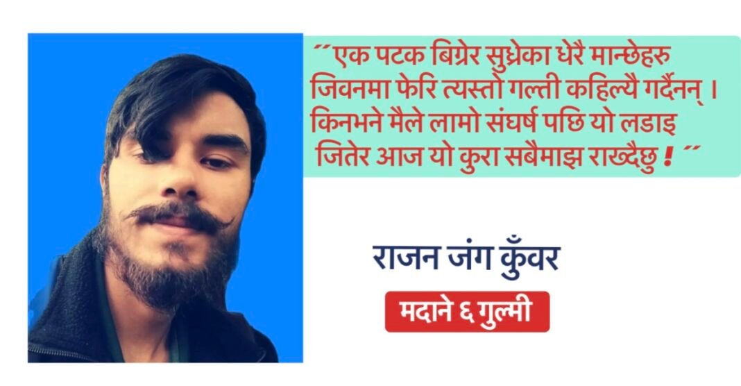 सहरको बसाइँ सङ्गत त्यस्तै साथिभाइ कुलत तिर फसे यसरी कुलतमा फसे कि अब मेरो भबिस्य नै कुलत बिना बाच्नबनिसकेको थियो ।। सानो कलिलो भबिस्य निर्माण गर्ने त्यो उमेरमा माया प्रेम गरेर बस्नु नै मेरो जिन्दगीभर को ठूलो गल्ती रहेछ मायागर्नु हैन माया गरेर निभाउन नसक्नु ठूलो गल्ती रहेछ ।। मायाको अर्थ बेलैमा बुझ्न नसक्नु झन ठूलो गल्ती रहेछ ।।
