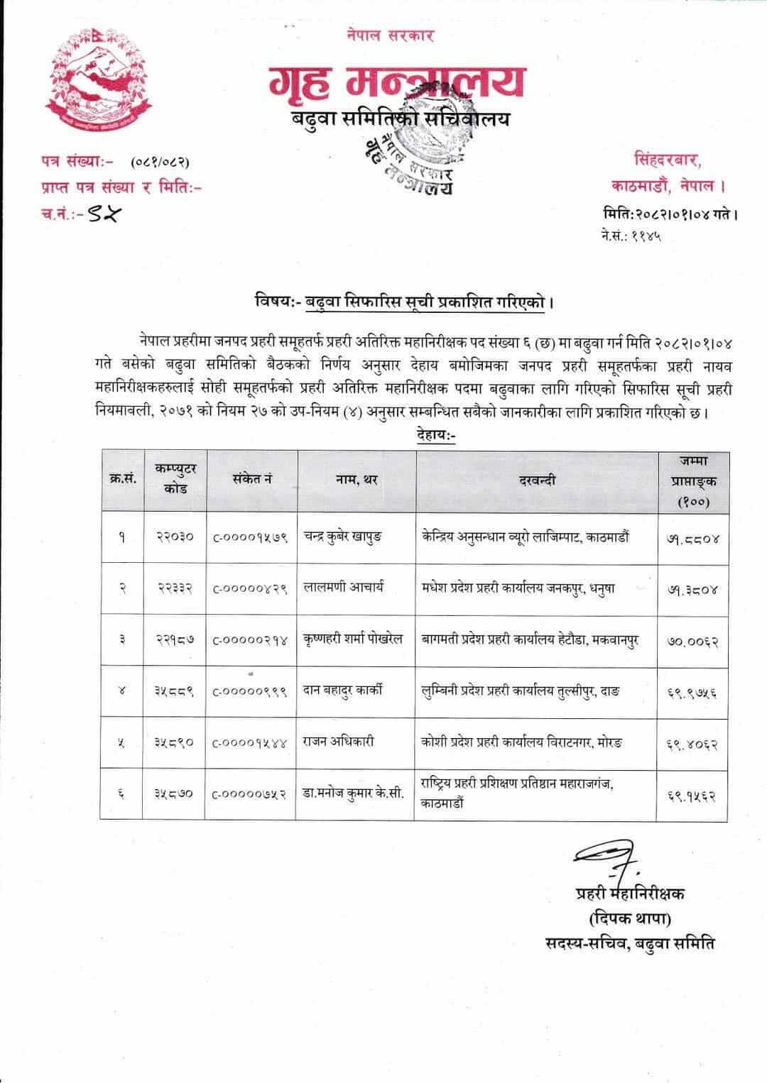 नेपाल प्रहरीका ६ जना डीआईजीहरुलाई अतिरिक्त महानिरीक्षक (एआईजी) मा बढुवा गर्न सिफारिस गरिएको छ । सिफारिस सूचीको पहिलो नम्बरमा चन्द्र कुवेर खापुङ छन् ।