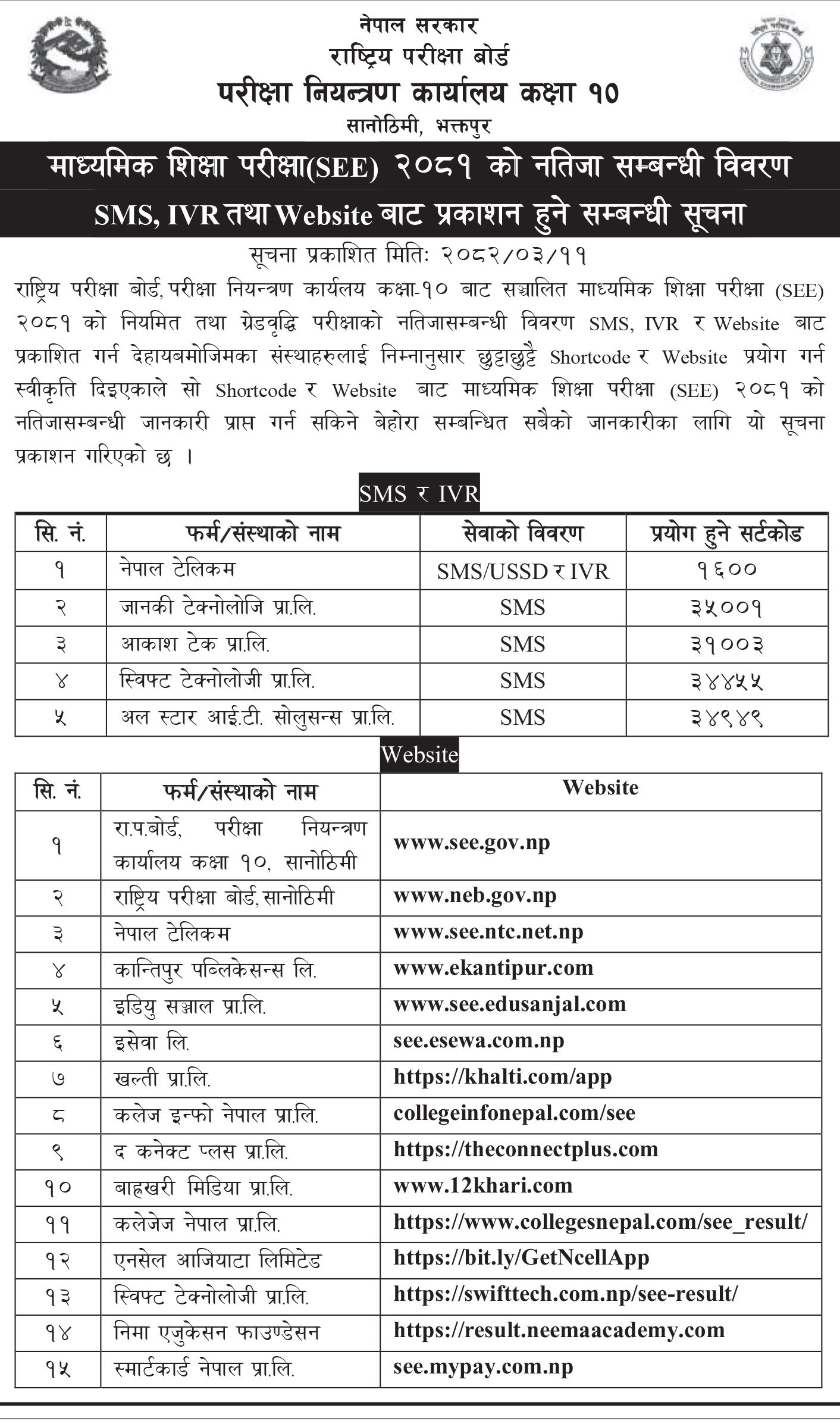 नतिजा प्रकाशनका लागि सरकारी तथा निजी क्षेत्रका विभिन्न संस्थालाई स्वीकृति प्रदान गर्दै बोर्डले एक सूचना प्रकाशित गरेको छ । बोर्डले एसईई नतिजा थाहा पाउन सकिने वेबसाइट, एसएमएस र आईभीआरका विकल्प उपलब्ध गराएको हो ।