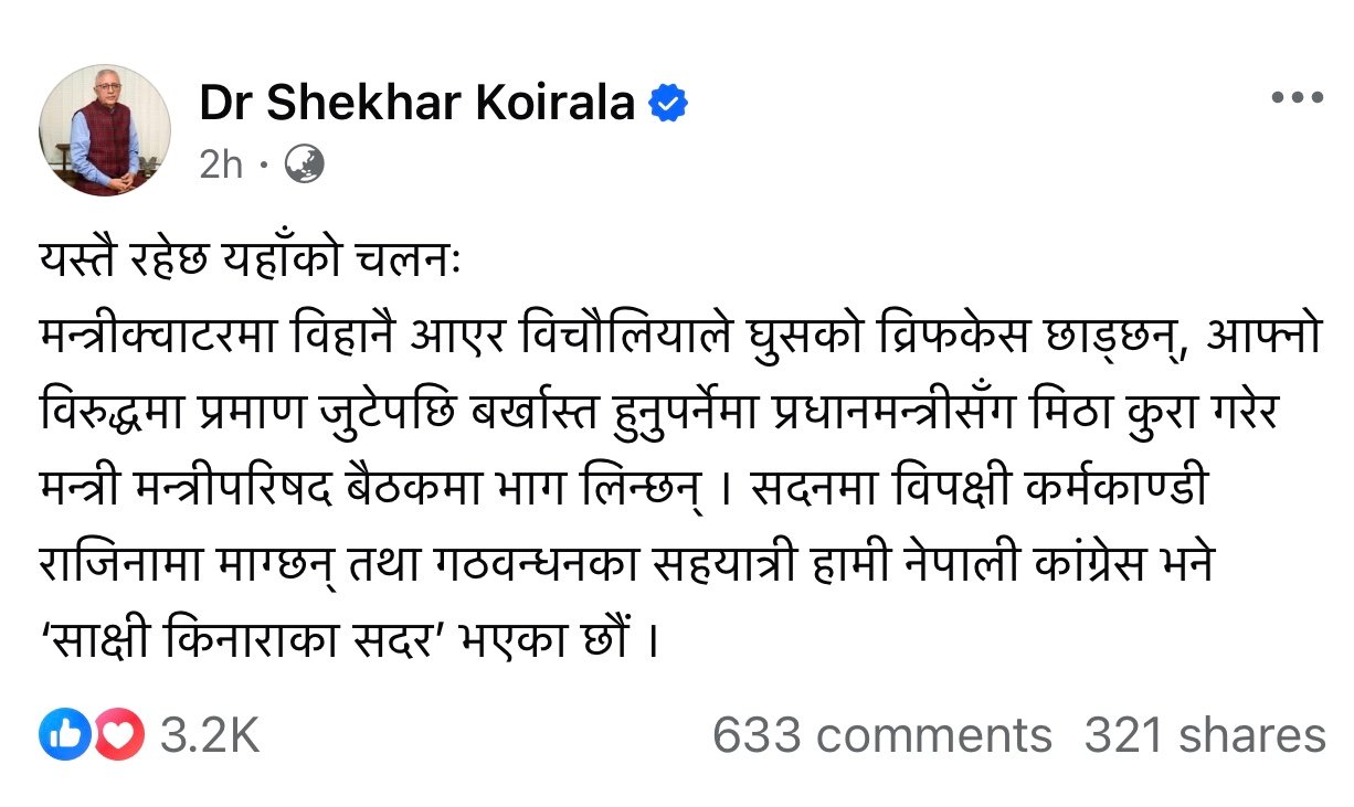 ‘यस्तै रहेछ यहाँको चलन’ भन्दै कोइरालाले फेसबुकमा लेखेका छन्, ‘मन्त्रीक्वाटरमा बिहानै आएर विचौलियाले घुसको ब्रिफकेस छाड्छन्, आफ्नो विरुद्धमा प्रमाण जुटेपछि बर्खास्त हुनुपर्नेमा प्रधानमन्त्रीसँग मिठा कुरा गरेर मन्त्रिमन्त्रीपरिषद बैठकमा भाग लिन्छन् ।’