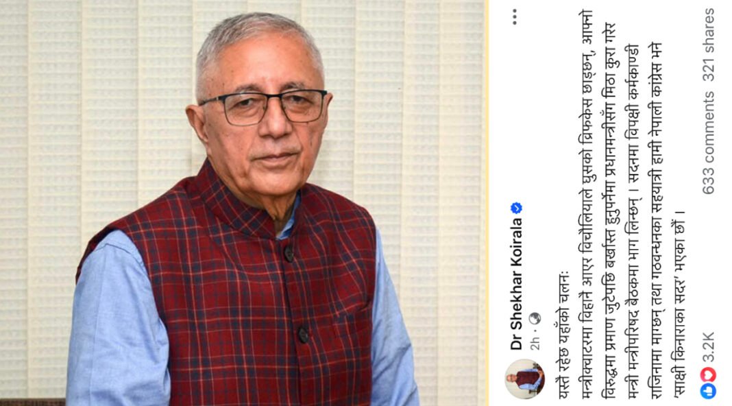 ‘यस्तै रहेछ यहाँको चलन’ भन्दै कोइरालाले फेसबुकमा लेखेका छन्, ‘मन्त्रीक्वाटरमा बिहानै आएर विचौलियाले घुसको ब्रिफकेस छाड्छन्, आफ्नो विरुद्धमा प्रमाण जुटेपछि बर्खास्त हुनुपर्नेमा प्रधानमन्त्रीसँग मिठा कुरा गरेर मन्त्रिमन्त्रीपरिषद बैठकमा भाग लिन्छन् ।’