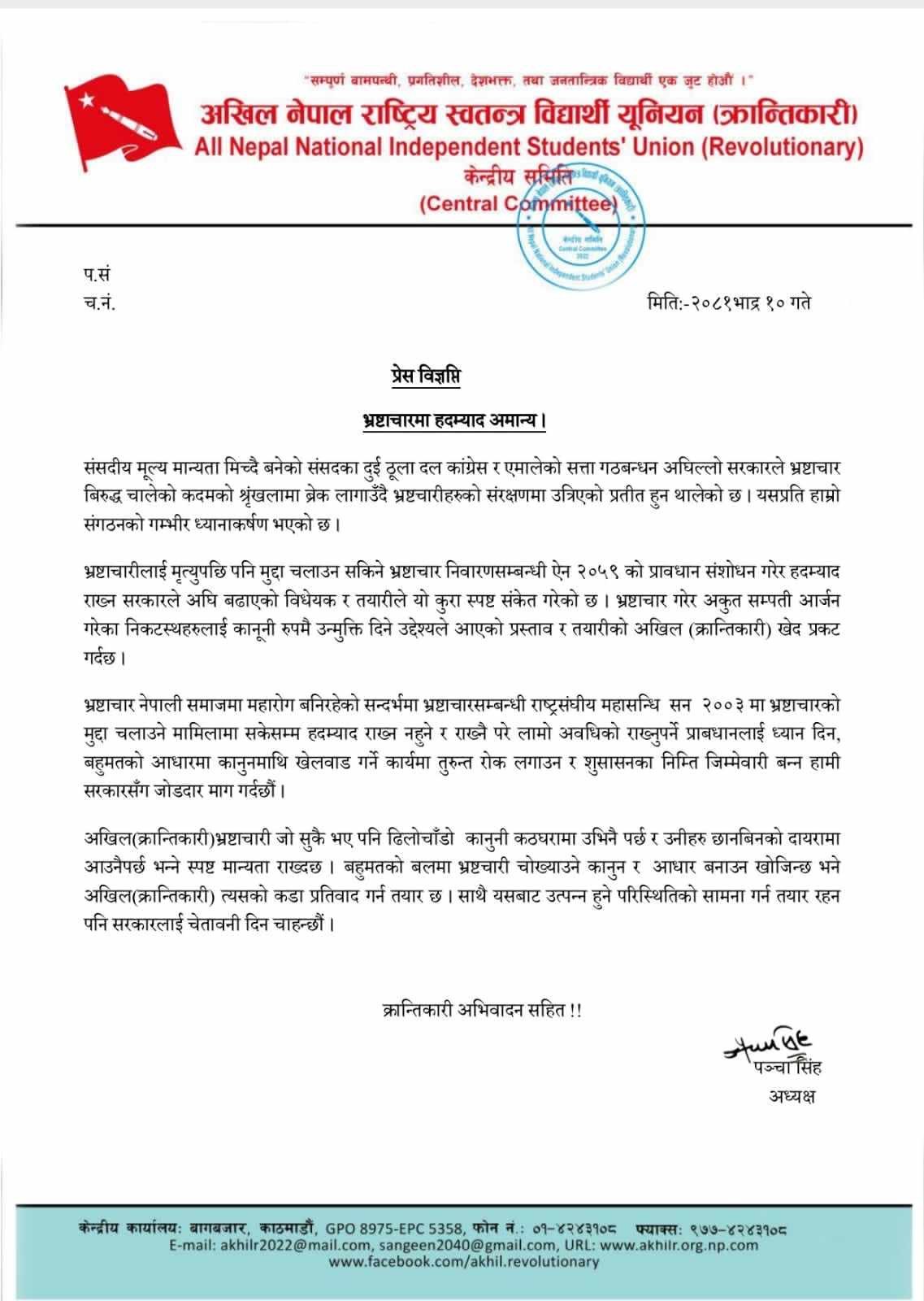 अखिल (क्रान्तिकारी)का अध्यक्ष पंचा सिंहले आज एक बिज्ञप्ती जारी गर्दै भ्रष्टाचारीलाई संरक्षण गर्ने उदेश्यले ल्याउँन लागेकोहदम्यादको बिषय आफूहरुलाई मान्य नहुने जनाएकी छन्